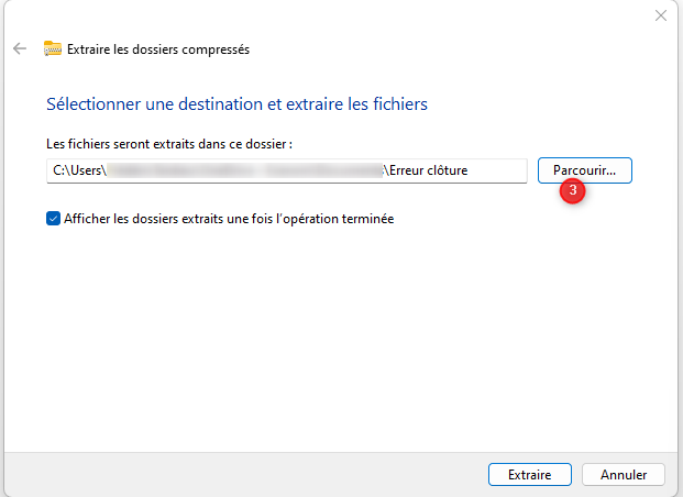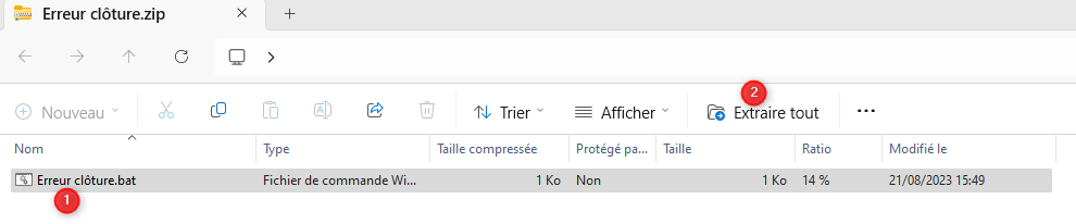 - Sélectionnez le fichier "Erreur clôture.bat" puis cliquez sur "Extraire tout" :